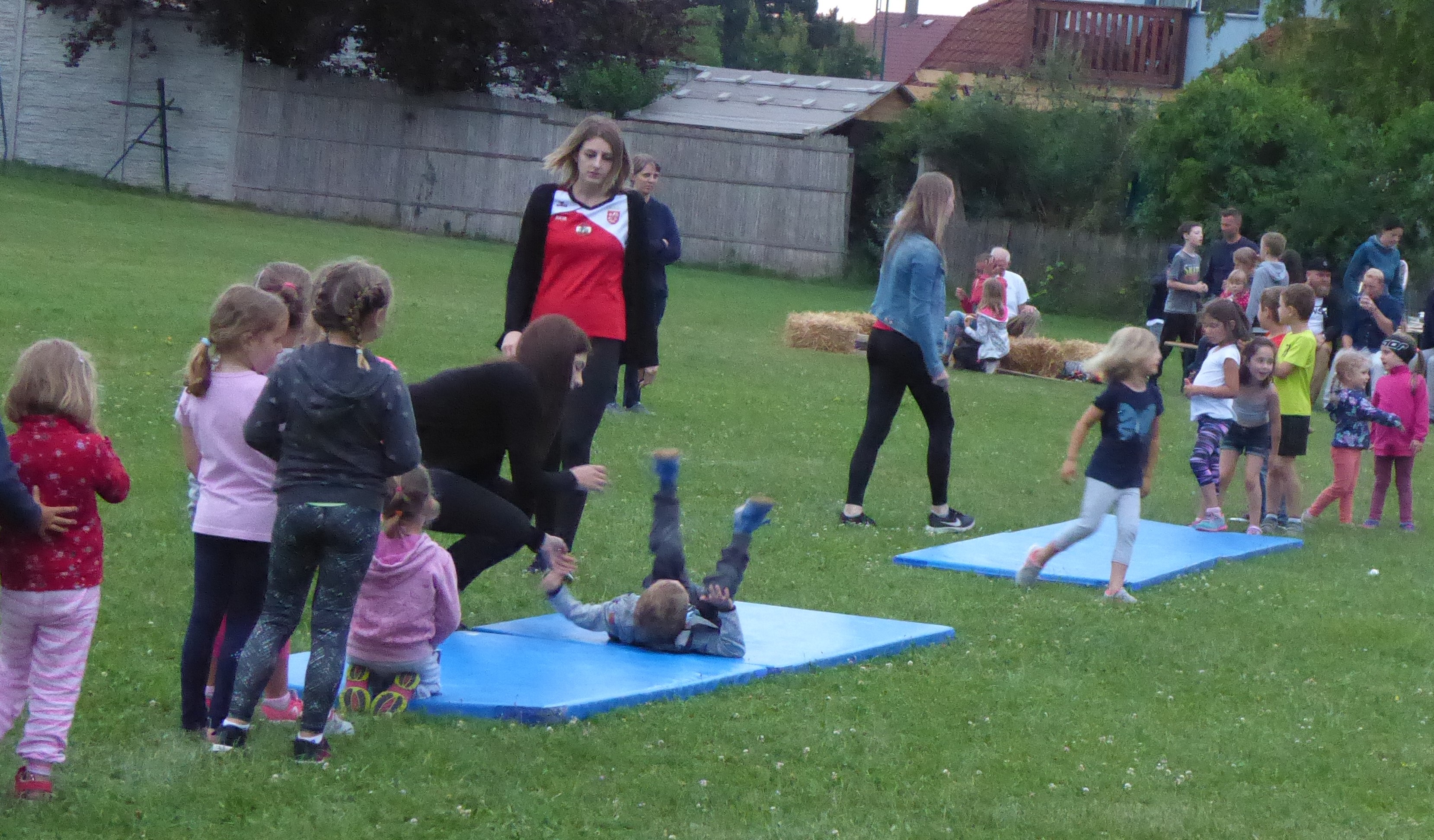 Gegen 20 Uhr brachte die FF den Wipfel des Maibaums, die Jugendkapelle spielte auf und bald begann die Vorführung der Kindergruppen (Turnmäuse 4 bis 6 Jahre und Sportfüchse 7 bis 10 Jahre). Im Vorjahr trat die Gruppe zum ersten Mal auf und ein Jahr später konnte man schon deutliche Fortschritte sehen! Ein toller Erfolg für die jungen Turnerinnen und Turner und natürlich für ihre Trainerinnen Sophie und Julia Nagl sowie Bettina Berghold.
