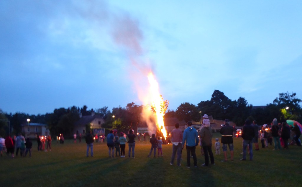 Etwas früher als sonst, es begann kurz zu tröpfeln, versammelten sich die Mitwirkenden mit Fackeln um den Holzstoß, immer ein stimmungsvoller Moment, und der Stoß wurde entzündet. Zuerst rauchte es etwas, aber schließlich brannte der Stoß wieder sehr beeindruckend.