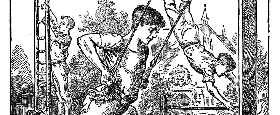 Die Burschen und Herren dagegen sind sich durchaus bewusst darüber, was sie da auf der Hasenheide tun: Sie treiben Sport. Denn heute ist die offizielle Eröffnung des ersten öffentlichen Turnplatzes der Welt. Auf dem ehemaligen Gehege für kurfürstliche Hasenjagden schwingen sie in den Seilen, stemmen sich die Stämme hinauf und balancieren über Balken. Barren, Reck und Hantel, Laufbahn, Labyrinth und Schwimmgraben, Turnpferd, Schwebebaum und Kletterstange … Und mittendrin steht ein Mann von hoher Statur, kräftig, muskulös, schroff, etwas verlottert, er wirkt rebellisch, rauh. Es ist ihr Anstifter: Friedrich Ludwig Jahn.
